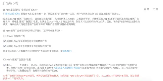 (2)APP内无广告,但先前投放了特定广告,可参考如下勾选,通过苹果审核。