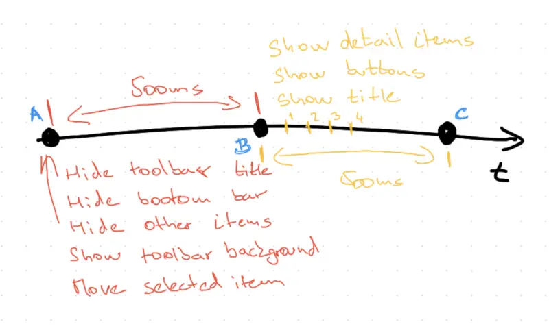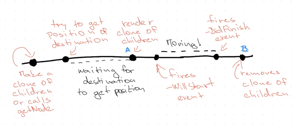 您可以看到 A 点和 B 点。这是移动正在执行的时间段。您还可以看到 SharedElement 触发一些有用的事件。在这种情况下,我们使用 WillStart 和 DidFinish 事件。在启动移动目标 element 时,将源 element 和目标 element 的不透明度设置为 0,并在动画完成后将目标 element 的不透明度设置为 1。