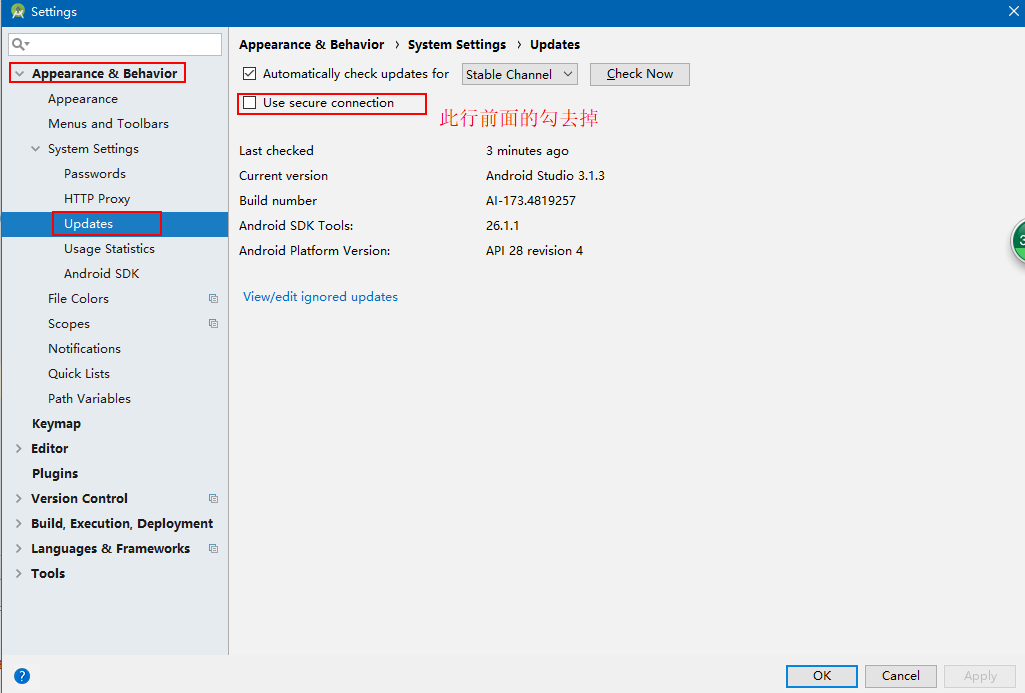 android studio 翻墙后也无法下载插件问题 如此风景 2018-08-07 1,240 阅读1分钟 老版本 File->Settings->Apparence & Behavior->System Settings->Updates->use secure connnection 勾去掉 新版本