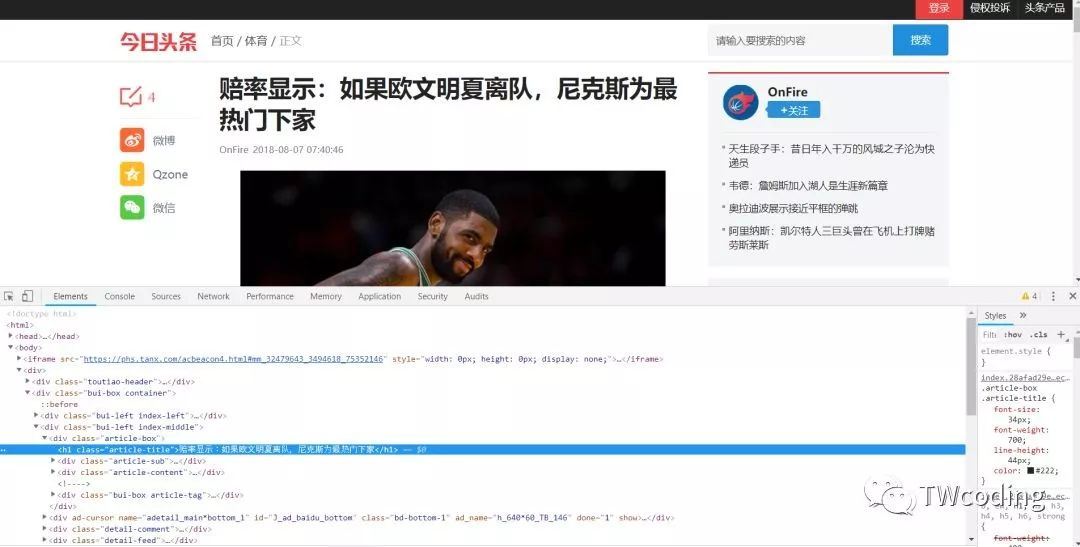 点击此文章的链接,即可跳转到此文章的详细页面。然后我们打开开发者工具。就可以提取新闻的标题,作者,来源,内容等一些我们想要的信息了。如下图所示。