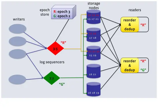 LogDevice将日志里的记录顺序和实际存储的顺序区分开来,通过序列器产生一个学号,对每一行存储的日志进行重新序列标定。一旦一行记录被标定了这个序列号,接下来该条记录(数据)就会被保存在集群中任一位置。注意,这里提到的序列号不是一个数字,而是一对数字,第一个数字叫做“ epoch number”,第二个是相对于第一个的偏移量。序列号生成器本身也是需要做好容灾的,也就是说,一旦一个序列号生成器服务不在线,另一个一定要被立即启用,而它生成的序列号要比当前已经存在的序列号大。FaceBook使用ZooKeeper保存序列号(Epoch Number)。