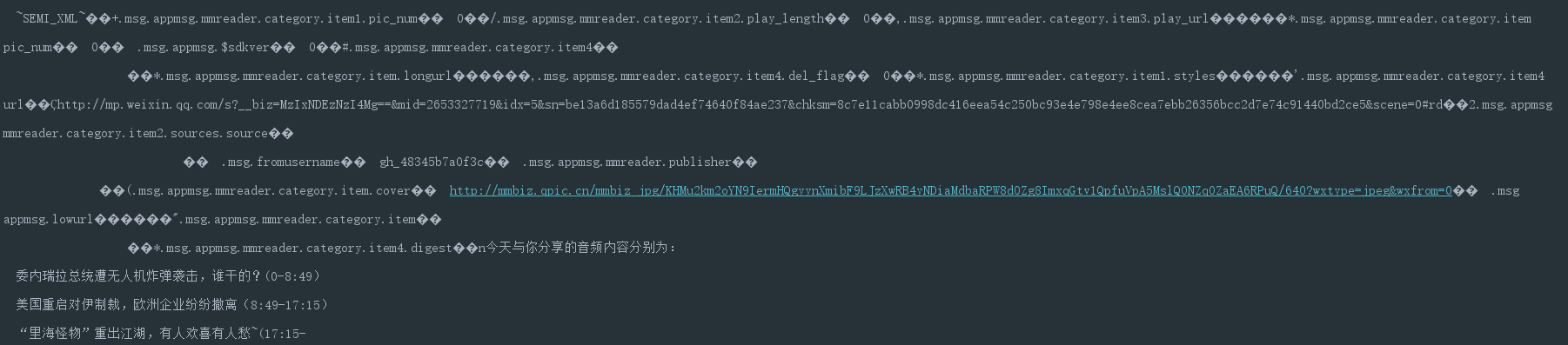 那么我们就将目光放在后第一行的Map上,是不是ay.WA(String str)这个方法做了解析操作呢? 我对com.tencent.mm.sdk.platformtools.ay中**WA()**这个方法进行了hook,取得其返回值,这个返回值是一个Map类型的数据,在打印出其内容后,我的猜想被验证了。 **WA()**这个方法将刚才的内容解析成了一个便于我们读取的map。其中包含了该条推送包含的图文消息数量,以及公众号的id,名称,对应的文章url,图片url,文章描述等信息。 晚餐总算可以加鸡腿了。啊哈哈哈哈。