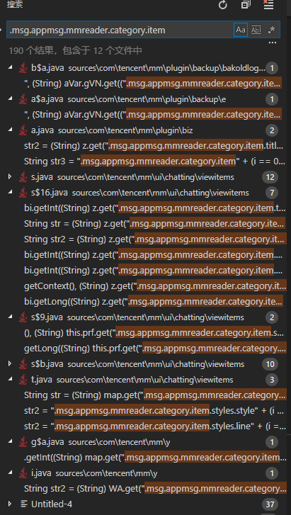 之前我将微信的几个dex包的代码分别反编译出来以后放到了一个文件夹下,然后使用VSCode打开,用于平时的查看, 虽然微信反编译出来的源码乱七八糟, 但是有的代码能看的。 我们看到上面导出来的数据是存在一些乱码的,那么我猜测微信内部实现了一个解码工具,如果我们能够hook到这个解码工具,是不是就可以获取到解码之后的正确数据了呢? 说到解码,根据微信以往的数据传输来看,这些数据很有可能是以XML的格式进行传输的,既然涉及到xml,那就一定是键值对的形式,我们去到的数据中除了有乱七八糟的小方块,还有诸如“.msg.appmsg.mmreader.category.item”这类看起来有用的内容。 我打开vscode,全局搜索“.msg.appmsg.mmreader.category.item”,令人高兴的是,搜索出来的结果并不多,这说明这个值确实是有意义的值,挨个查看这些源码,在一个包为:“ com.tencent.mm.plugin.biz;”下中一个名为“a”的类中,我发现了一些有意思的东西。