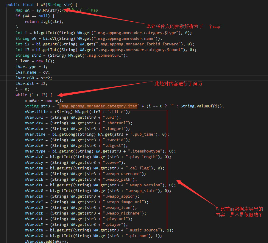 方法名为wS的一个方法,接收了一个String类型的值,且其内部做了一些数据取出的工作。 难道这个str参数就是我想要的标准xml吗? 经过hook验证,打印其参数后发现,并不是,参数内容的格式和之前数据库中的格式是一致的。