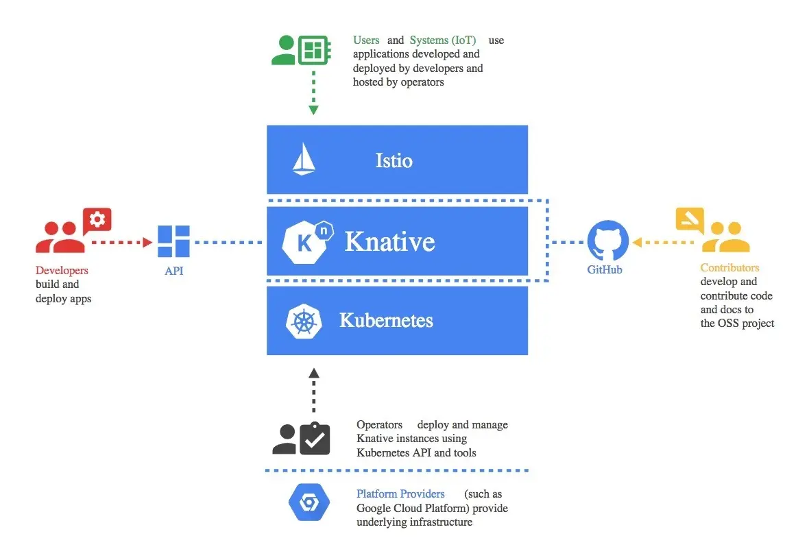 Knative构建在Kubernetes和Istio之上,它的设计考虑到了多种角色通过该框架进行交互,包括开发人员、运维人员和平台提供者。
