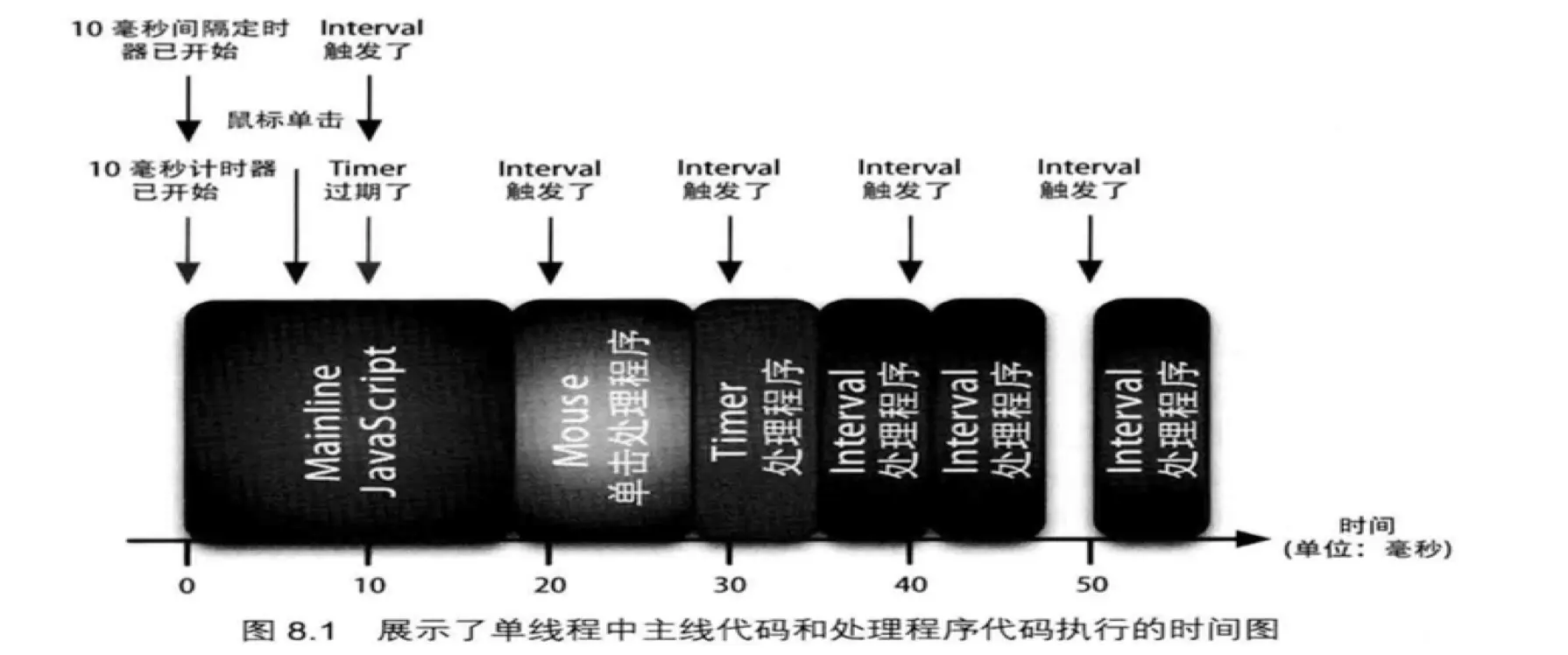 这张图的X轴是以毫秒为单位的时间轴矩形快的大小意味着js代码的执行部分以及执行时间。下面本胖就以时刻为单位来简单明了地说清楚这张图的内涵哈。