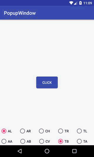 17 // 第一个参数是PopupWindow的父View,第二个参数是PopupWindow相对父View的位置,