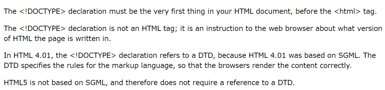 总结一下:因为html4是基于SGML这个标记语言的集合,既然是集合说明里面有各种的标准,那么DTD就是指出了当前html文件是用的是哪个SGML规则。 html5不存在这个问题,所以只需要简单的声明浏览器就可以正确渲染页面啦。