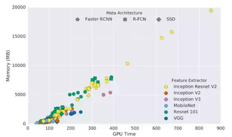 图4 Faster R-CNN、R-FCN 和 SSD 的检测性能,速度与准确性的权衡,更高的 mpA 和更低的 GPU 时间是最佳的。