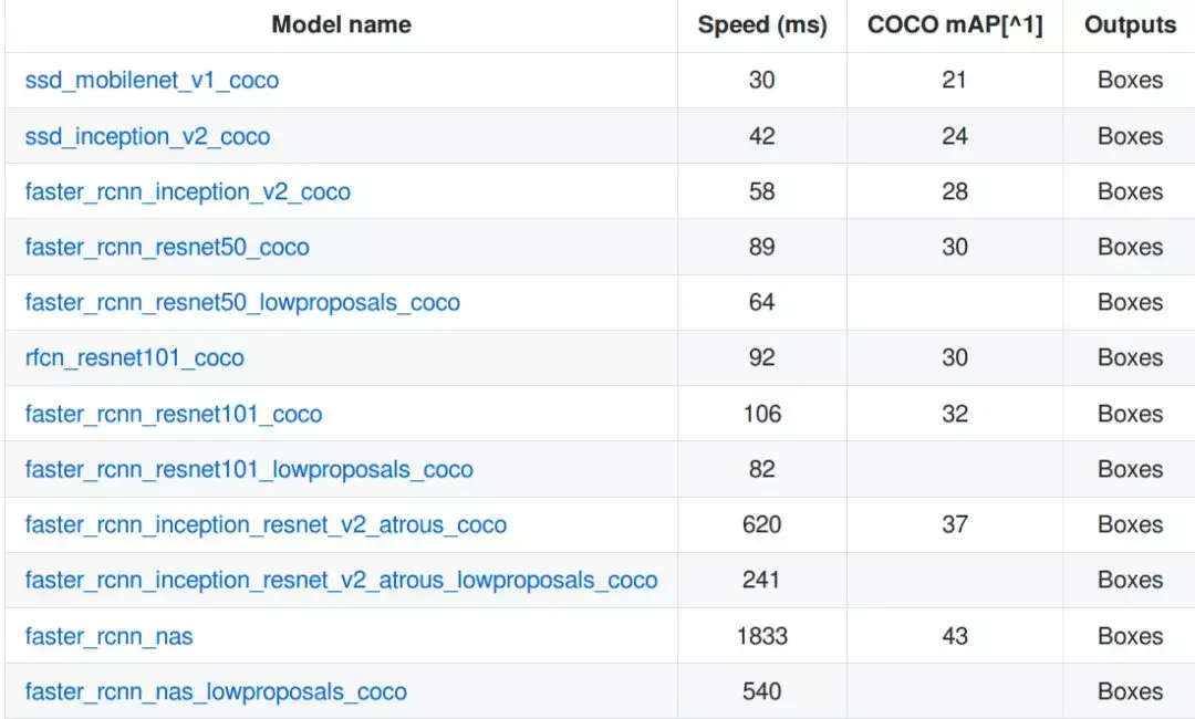 我们的实验选择了以下的模型,这些模型可以在 TensorFlow 目标检测API 的Zoo 模块中找到。