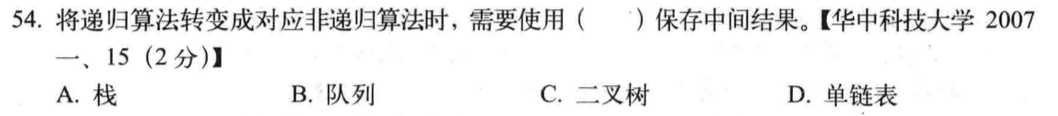 将递归算法转换成对应的非递归算法时,需要使用栈来保存中间结果