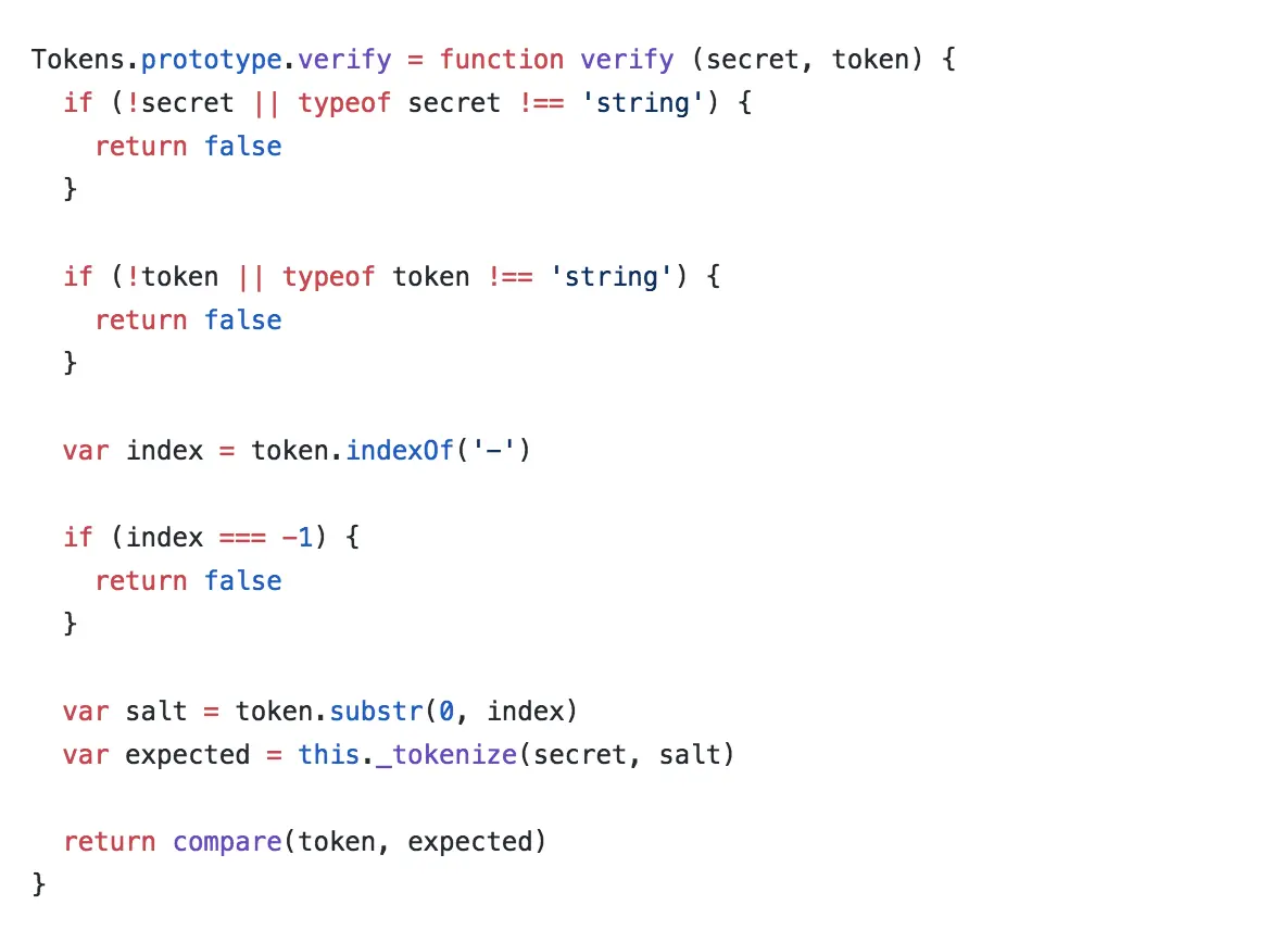 - 解密过程: const [salt, hash] = token.split('-'), 重新计算hash=哈希函数(salt+密码), 然后比较