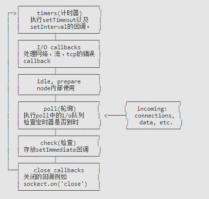 4、开始Event loop,就是上面的各个观察者按顺序检查;