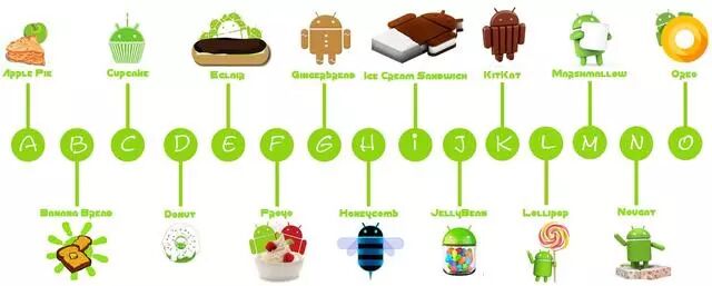 纸杯蛋糕(Cupcake)、甜甜圈(Donut)、闪电泡芙(Éclair)、冻酸奶(Froyo)、姜饼(Gingerbread)、蜂巢(Honeycomb)﹑冰淇淋三明治(Ice Cream Sandwich)、果冻豆(Jelly Bean)、奇巧(KitKat)、棒棒糖(Lollipop)、棉花糖(Marshmallow)、牛轧糖(Nougat)、奥利奥(Oreo)。