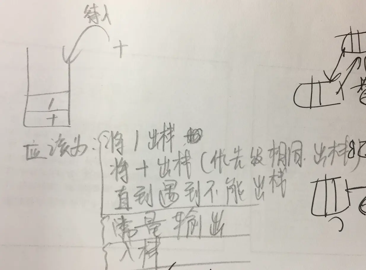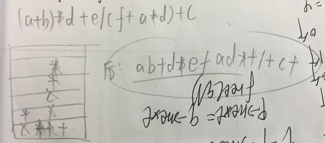 注意:出栈,如果遇到优先级小的,和优先级相同的,都必须出栈, 而且是一直出栈,知道无法出栈为止