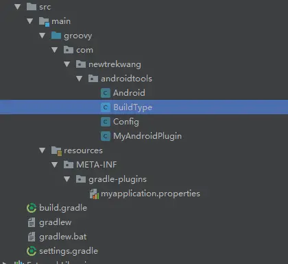 1.在/src/main/groovy里面编写插件源码,结构类似Java工程 因为android块里有defaultConfig块和buildTypes块,defaultConfig块里都是字段,所以定义一个Config类,buildTypes块里是数组,所以定义一个BuildType放单元素里的字段
