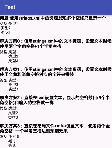 android:text="解决方案1:使用strings.xml中的文本资源,设置文本时候使用全角和半角空格对应的字符来拼装"