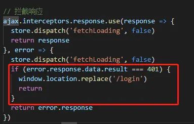 ,这样我们可以设置cookie生命周期为1天。接下来我们解决防止假token登陆的问题。由于假token无法与后端产生数据交互,直接在axios的拦截响应的方法下面判断状态码为401,就自动跳转到登陆页。代码如下:
