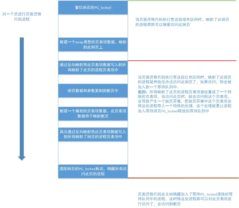 如果需要详细些说,那就是内存压缩中即将对一个页进行迁移工作,首先会对这个旧页上锁(置位此页的PG_locked标志),然后新建一个页表项数据,这个页表项数据属于swap类型,这个页表项数据映射的是这个旧页,然后把这个页表项数据写入所有映射了此旧页的进程页表项中,将旧页数据和参数复制到新页里,再新建一个页表项数据,这个页表项数据就是常规的页表项数据,这个页表项数据映射的是这个新页,然后把这个页表项数据写入到之前所有映射了旧页的进程页表项中,释放锁,唤醒等待的进程。