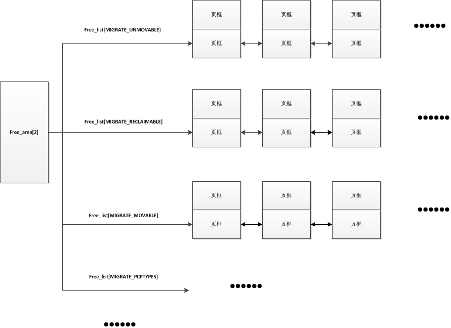 在伙伴系统中,因为页的分类关系,在每种长度相同的连续页框中又会分出多个不同类型的链表,如下,