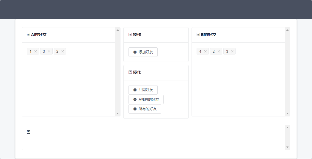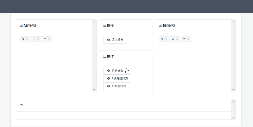 页面如下,点击A独有的好友按钮,经过后台的数据获取,页面下方显示独有的好友1。