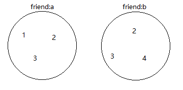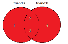 共同好友也就是好友A和好友B共有的好友,两个数据做交集即可得到共有的数据,即A好友∩B好友={1,2,3}∩{2,3,4}={2,3} 。红色部分就是交集的结果