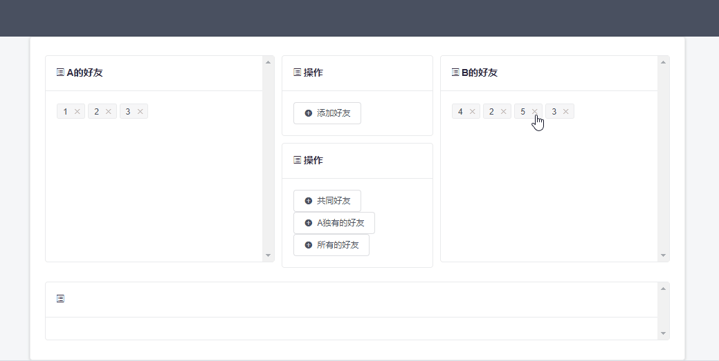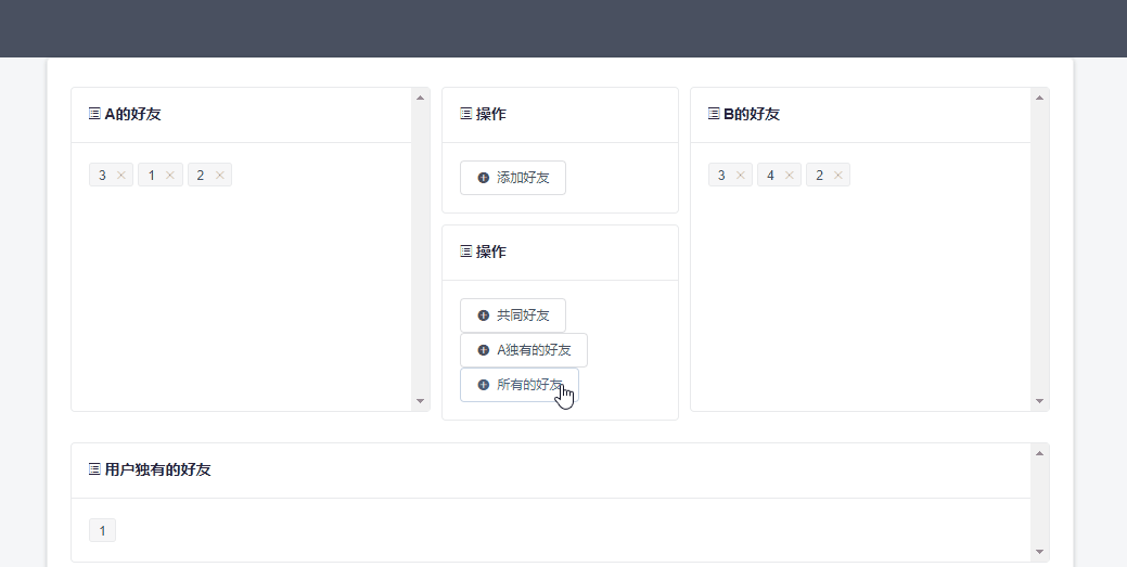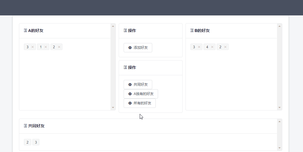 添加完毕后,A有好友1、2、3,B有好友2、3、4。