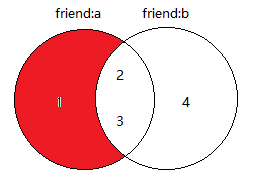 A独有的好友也就是取出A的好友在B好友中没有出现过的,也就是取差集,即A好友-B好友={1,2,3}-{2,3,4}={1},下方图片中红色部分就是差集的结果。