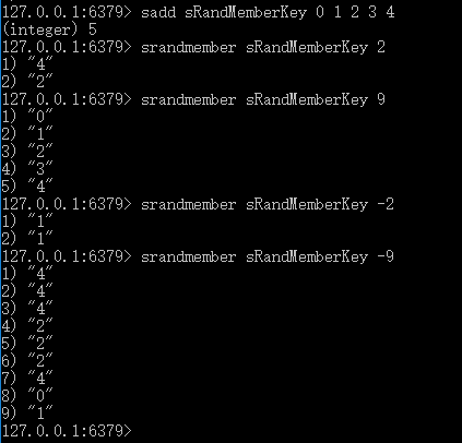 System.out.println("count是个整数且大于集合中元素的个数时:" + jedis.srandmember("sRandMemberKey", -9));