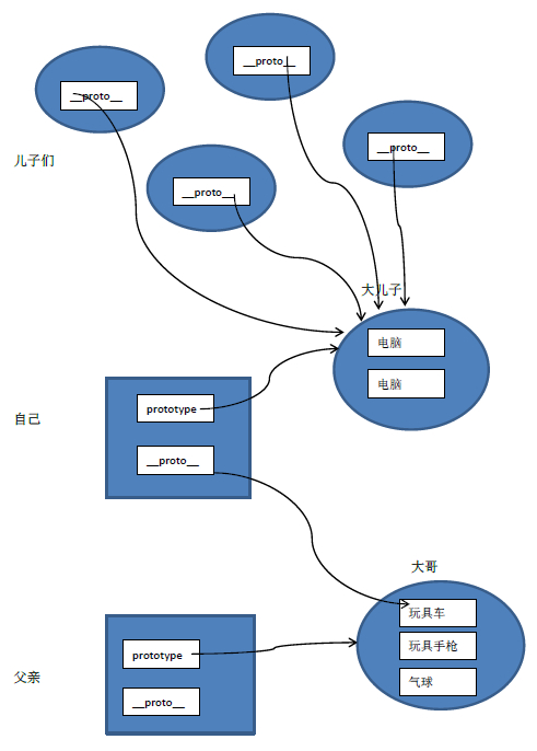 父亲(函数对象),先生了一个大儿子( prototype),也就是你大哥,父亲给你大哥买了好多的玩具,当你出生的时候,你们之间的亲情纽带(__proto__)会让你自然而然的拥有了你大哥的玩具。