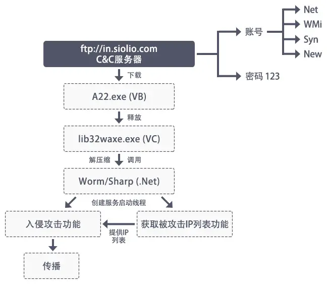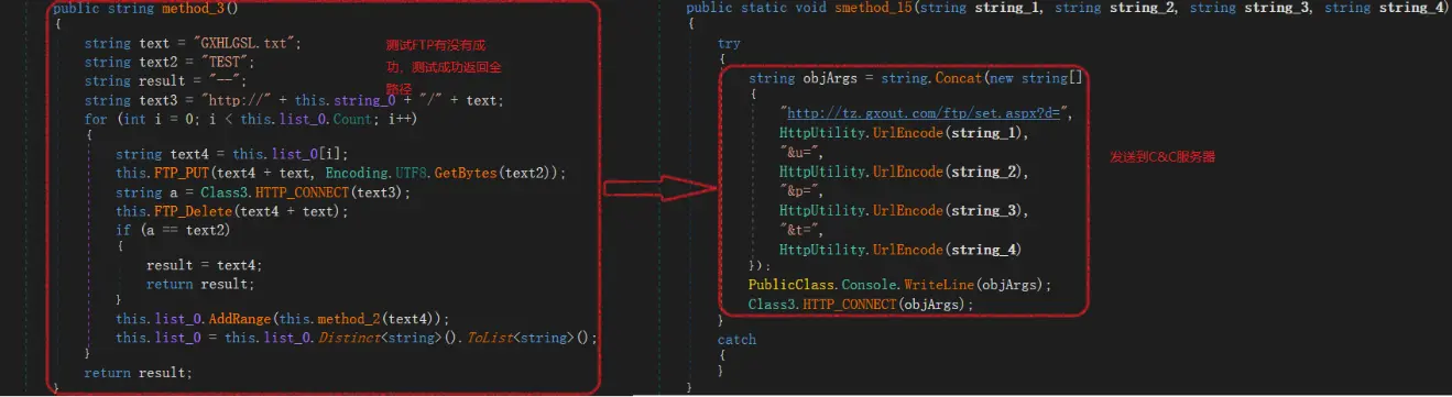 如果爆破成功则向目标IP上传测试文件,对上传路径进行Http请求,删除上传的文件,比较内容,相同则返回全路径,之后将网站的域名(ip地址)+ftp用户名+ftp密码+上传文件的完整路径进行URL编码发送到C&C服务器(hxxp://tz.gxout.com/ftp/set.aspx)上。程序流程,如下图所示: