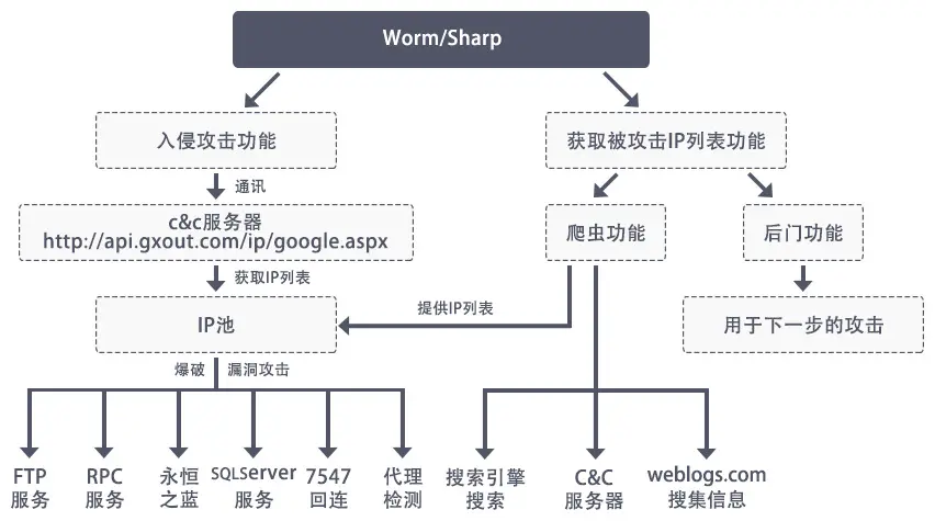 该蠕虫的目的是全网传播并将搜集到的相关信息发送到C&C服务器上,况且Worm/Sharp还有一个后门功能,黑客已经使用该系列的蠕虫收集了一年多的时间,在未来很有可能会发动大规模的攻击。