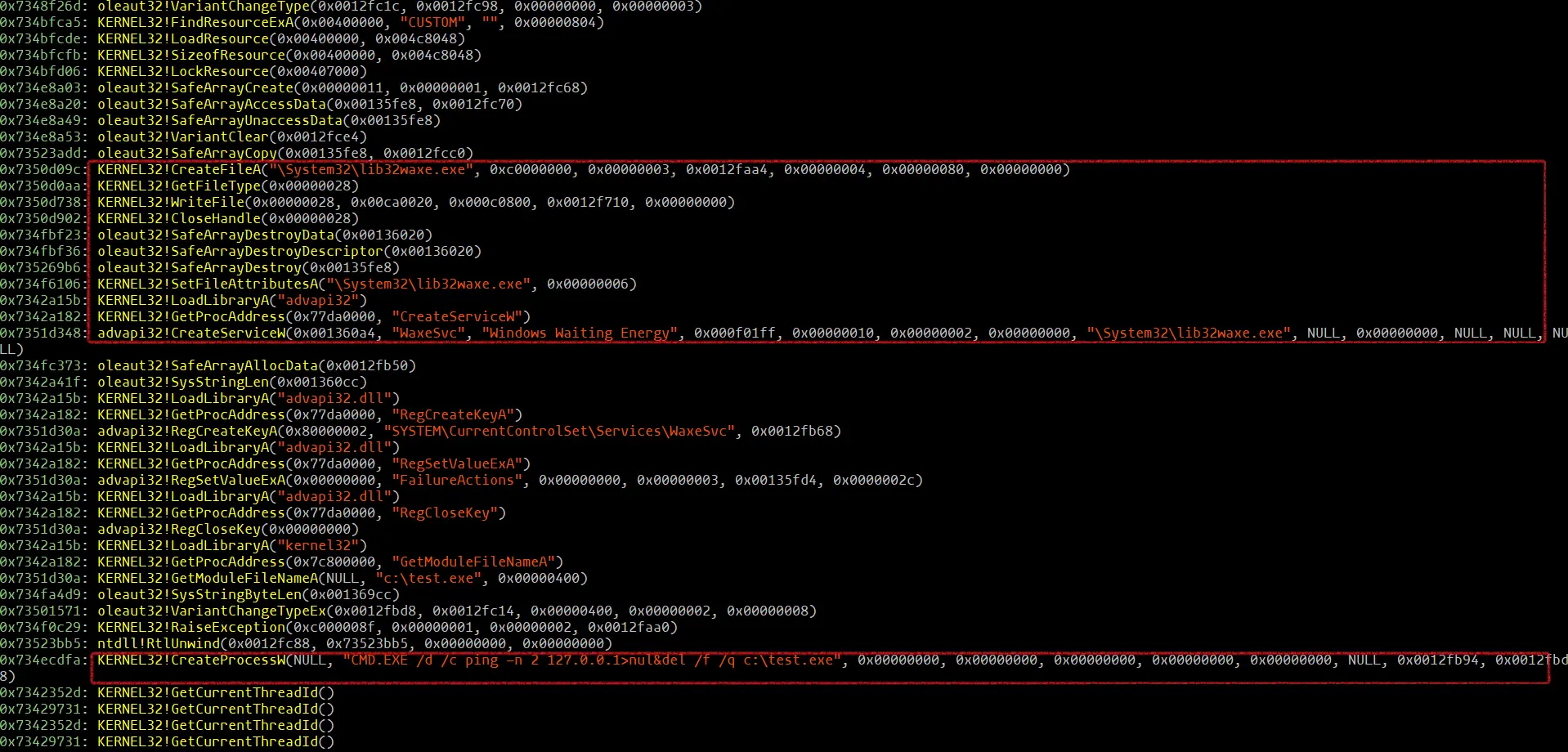 初始样本(A22.exe)由VB编写并且加了PECompact壳,在执行过程中会释放lib32waxe.exe,并创建服务WaxeSvc,主流程执行完后会启动自删除进程。初始样本主流程,如下图所示: