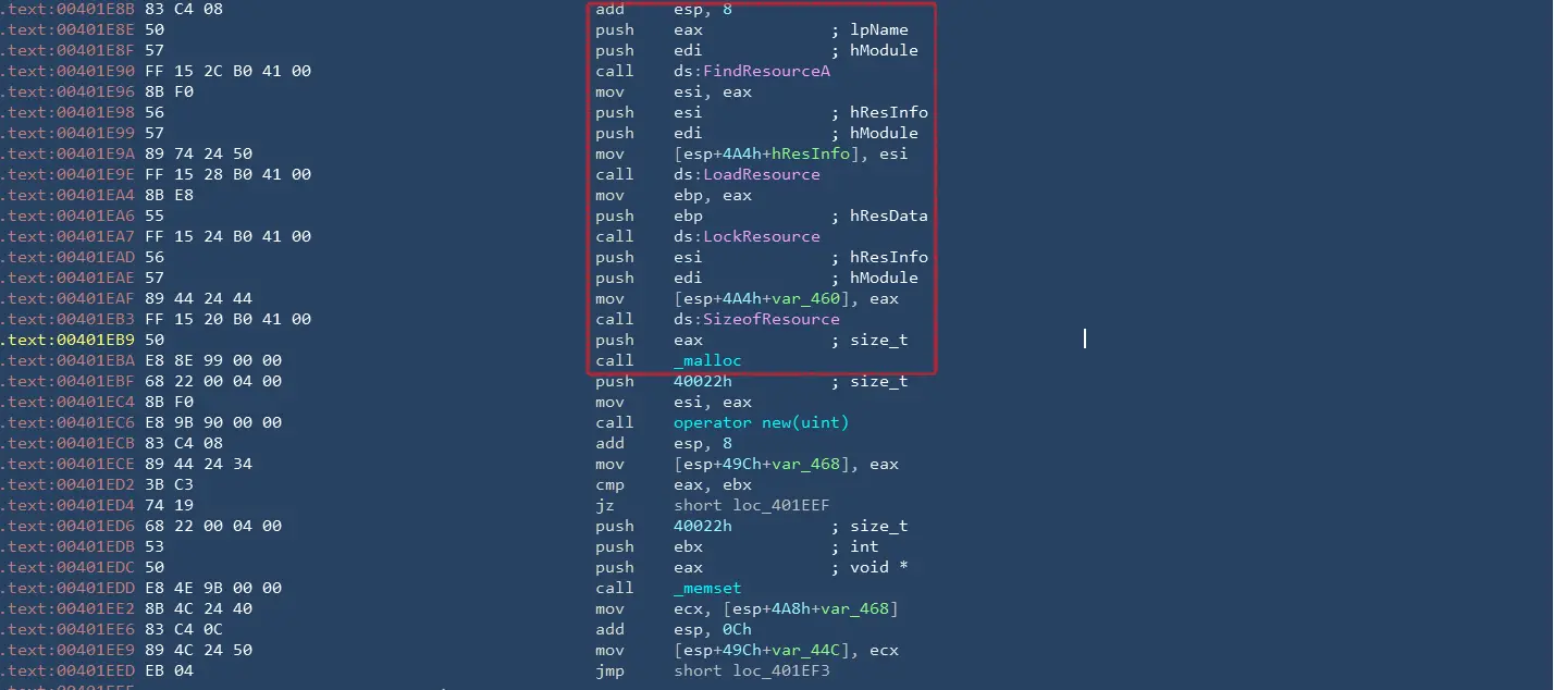 lib32Waxe.exe带有混淆器在执行过程中解压缩 Worm/Sharp蠕虫代码。载入二进制资源代码,如下图所示: