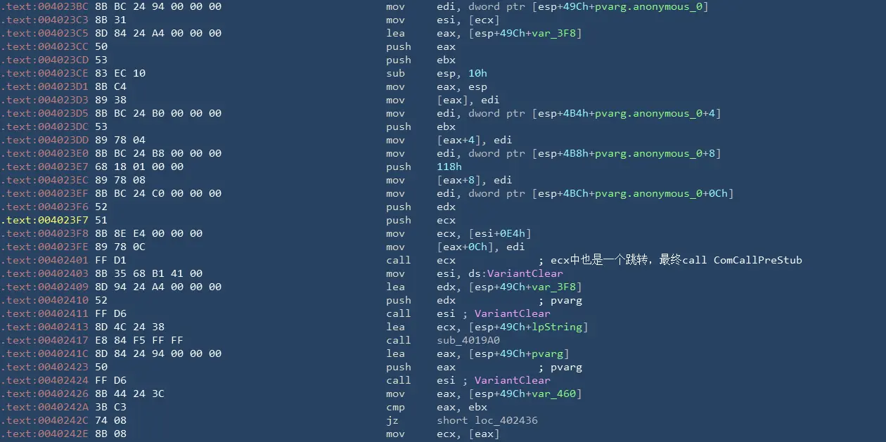 在最后使用CLR API 实现在C++中运行.Net恶意代码,调用Clr.dll中未公开的函数ComCallPreStub运行Worm/Sharp蠕虫。 调用ComCallPreStub函数相关代码,如下图所示: