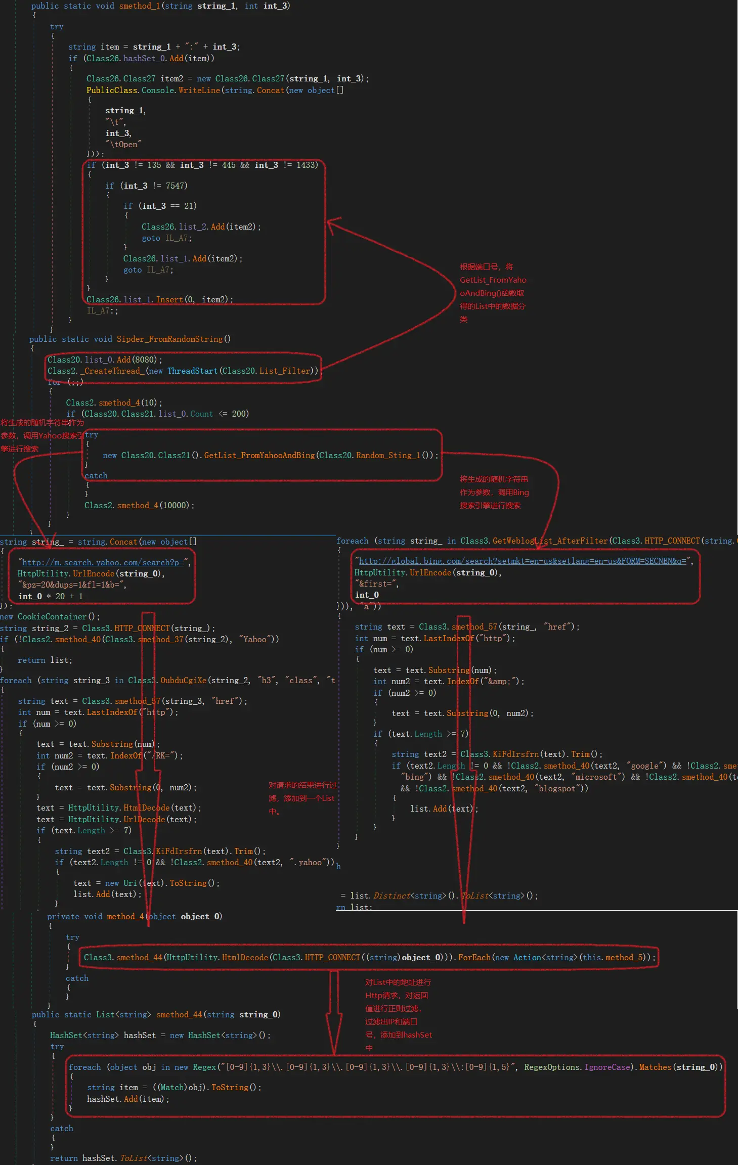 该蠕虫内置了爬虫功能,可以根据随机字符串搜索、关键字搜索、与C&C服务器通讯和Weblogs搜索来扩充自己的IP列表,为入侵攻击功能提供数量庞大的主机列表。