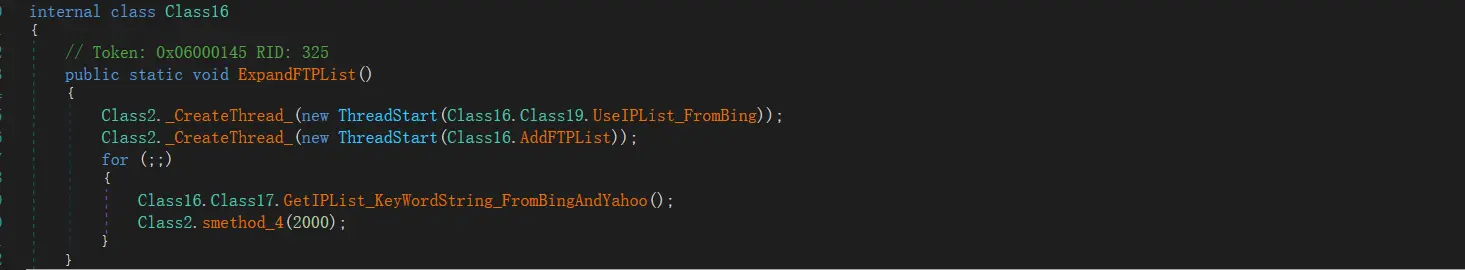 UseIPList_FromBing回调使用Bing搜索"ip:"+list列表中的地址,筛选21端口的IP地址,调用AddFTPList回调将筛选后的IP加入FTP爆破的List中,用于入侵攻击功能进行攻击。