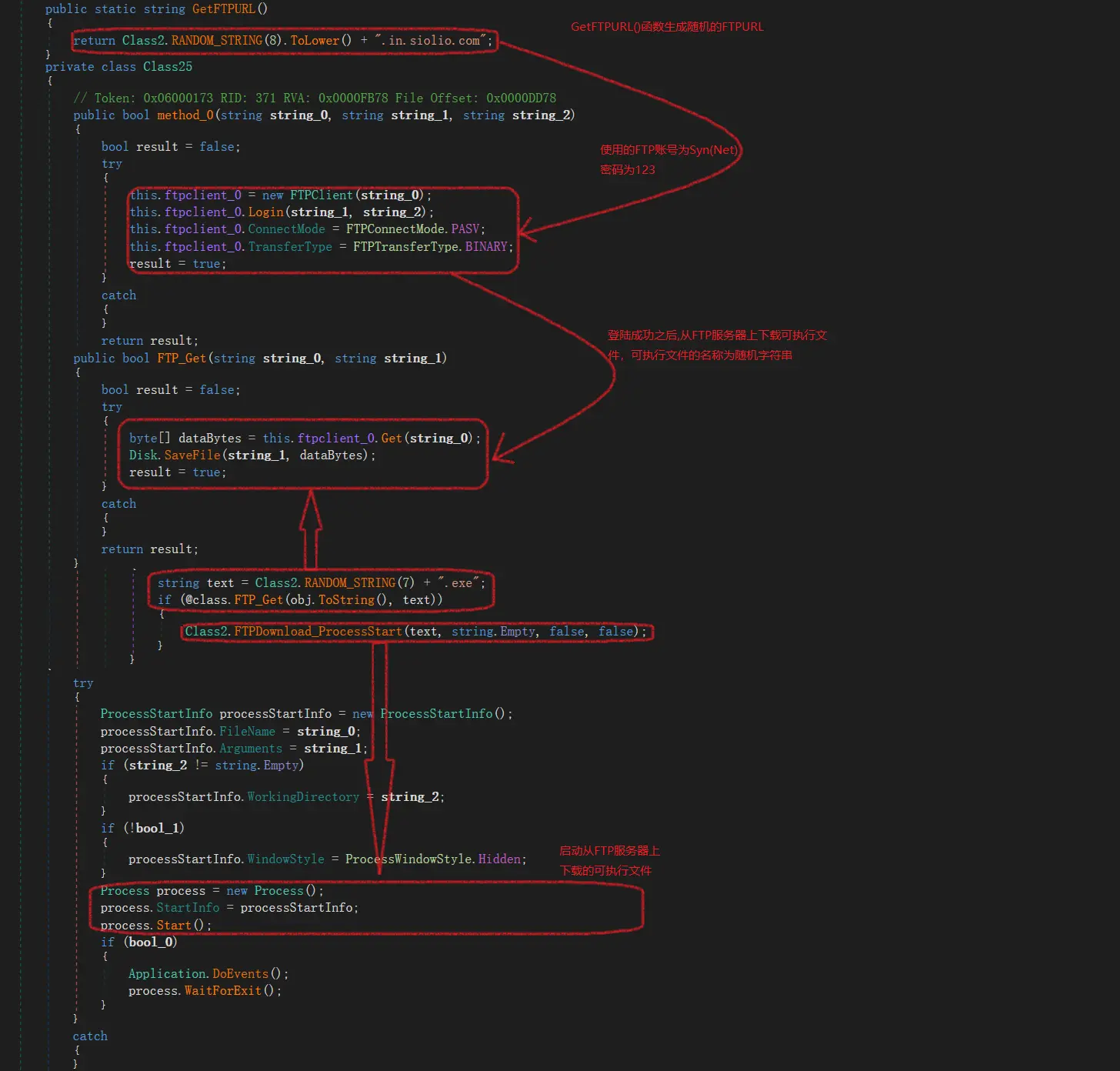 通过访问黑客的C&C服务器(ftp:// in.siolio.com),下载FTP上的exe并执行。该功能可以作为一个后门功能,便于后续攻击的展开。相关代码,如下图所示: