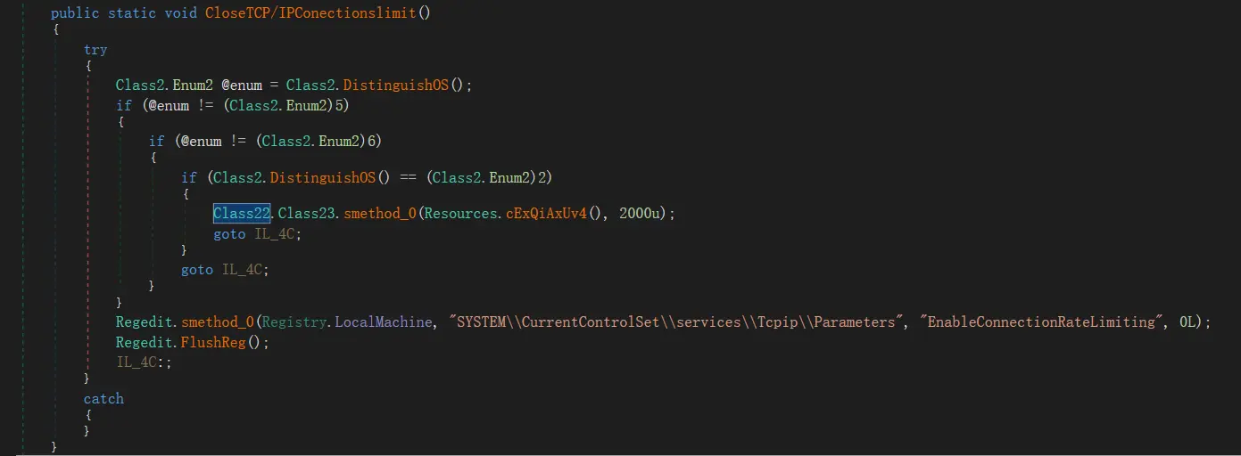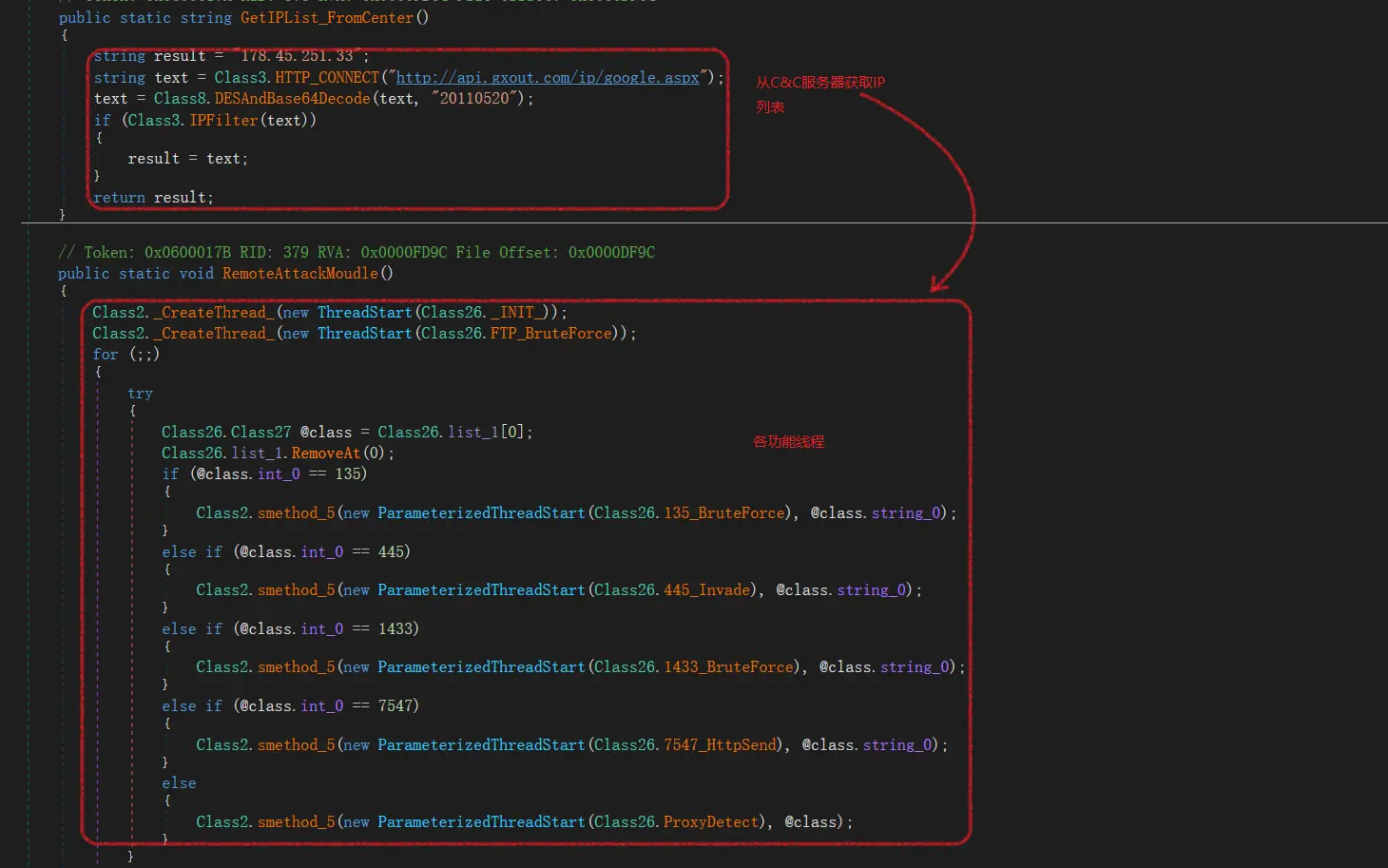 蠕虫会通过与C&C服务器(hxxp://api.gxout.com/ip/google.aspx)进行通讯获取加密后的IP列表,解密过滤后,加入相应的List中。入侵攻击功能分为以下6个部分:FTP爆破、135端口爆破、445端口入侵、1433端口爆破、7547端口回连、代理服务器检测,并且当断网的情况下,会自动遍历内网IP对内网的其他服务器进行爆破和漏洞攻击。功能线程,如下图所示: