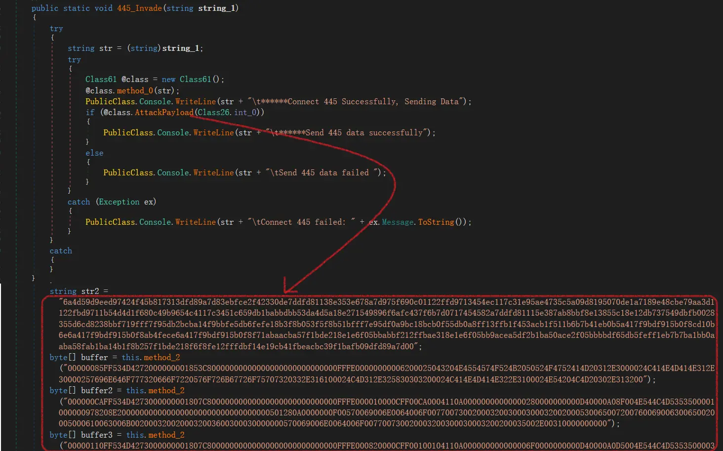 该蠕虫除了爆破功能之外还会通过漏洞进行入侵,使用永恒之蓝对服务器进行攻击。 部分Payload,如下图所示: