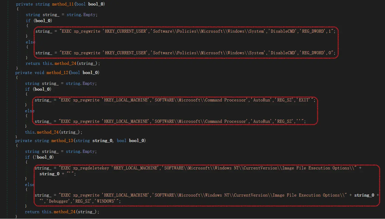 此外还会对目标主机的注册表进行操作,禁用CMD、映像劫持。注册表操作,如下图所示: