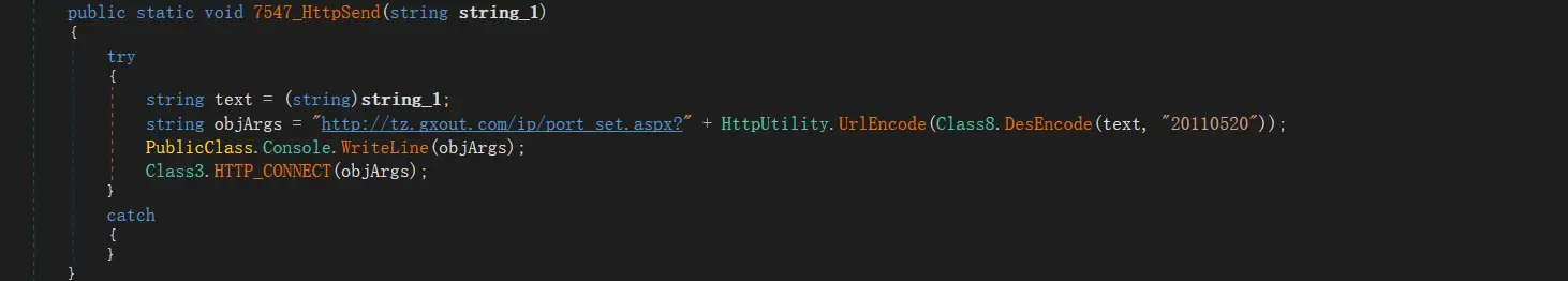 在获取被攻击的IP列表功能中已经对从C&C服务器获取的路由器IP列表进行了过滤和检测,入侵攻击功能中对该列表进行DES加密URL编码后发送到C&C服务器(hxxp://tz.gxout.com/ip/port_set.aspx)。通讯代码,如下图所示: