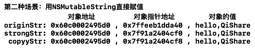 看到这里,同学们可能会有疑问,为什么不论是用strong还是copy修饰的对象,其指针指向的地址依然还是originStr的地址?为什么_copyyStr的值会变成“hello,QiShare”呢?不应该是“hello,everyone”吗? 咱们先不解释,卖个关子,我们接着往下看。