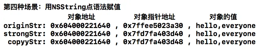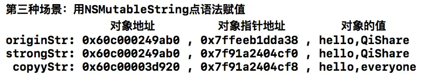 OK,这回我们终于看到我们希望看到的结果了, _copyyStr依然是“hello,everyone”,没有变成“hello,QiShare”, _copyyStr指针指向的地址不再是_originStr的地址。 细心的同学会发现,第三种在赋值的时候用了点语法,而不是直接赋值。 除了将 _strongStr = originStr2; 改为 self.strongStr = originStr3; _copyyStr = originStr2;改为 self.copyyStr = originStr3; 其余完全一样。