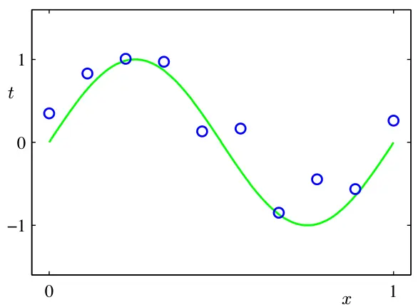 图1.2展示了由 N = 10 个数据点组成的图像,用蓝色圆圈标记。每个数据点由输入变量 x 的观测以及对应的目标变量 t 组成,他们都是由绿色曲线 生成的。
