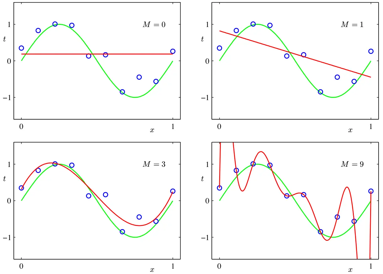 当M = 9 时,我们得到了对于训练数据的一个完美的拟合,也就是说多项式函数精确地通过了每一个数据点,但是拟合的曲线剧烈震荡(large oscillations),无法很好的表达函数