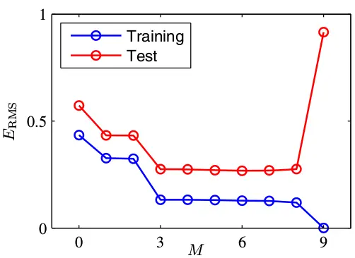 直观的原因是:有着更大的 M 值的更灵活的多项式被过分地调参,使得多项式被调节成了与目标值的随机噪声相符。