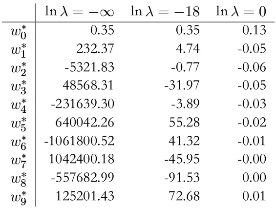 从表1.2可以看出, 当 改变的时候, M = 9 的多项式的系数