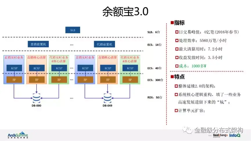 余额宝 2.0 的架构中用阿里云上的软负载均衡 SLB 替换了硬件负载均衡;用阿里云上的虚拟计算单元 ECS 替换小型机成为前置服务及中间件服务的服务器;用阿里云的 web 服务替换了前置服务器上的 weblogic。