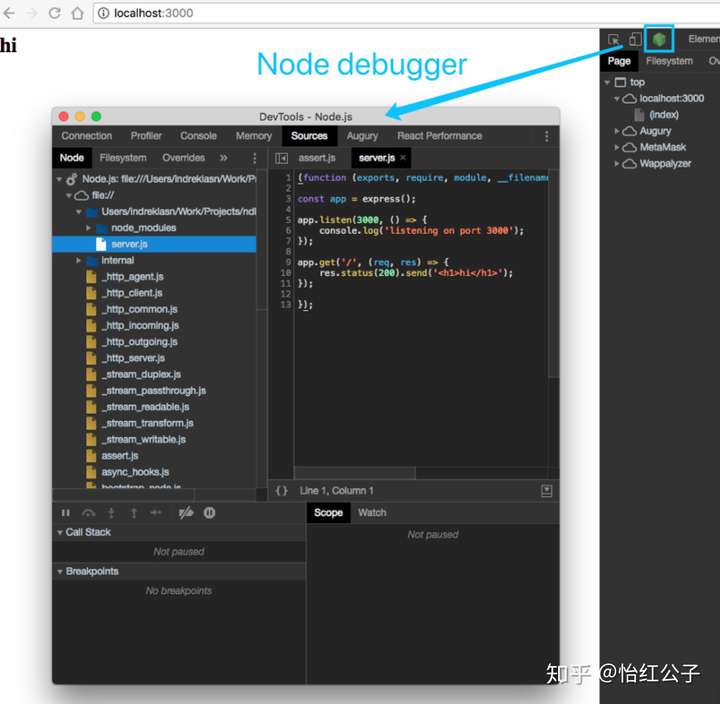 在前端使用 Chrome DevTool 进行断点调试已经是非常成熟了,在 Node.js(6.3+) 中也自带了一个类似的调试器,主要是在 Node 内部实现了一套 v8 调试器通信协议。启动的时候添加